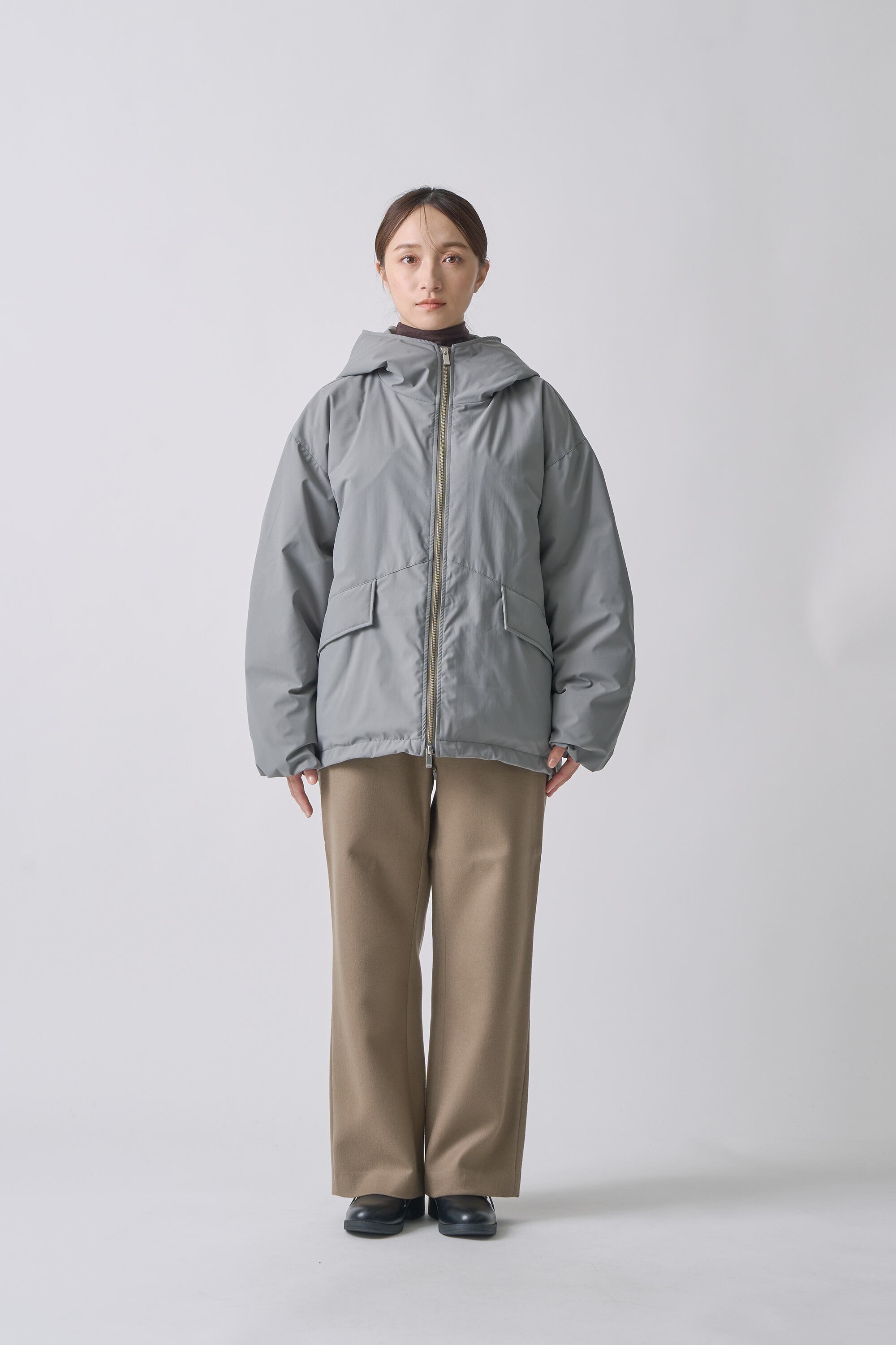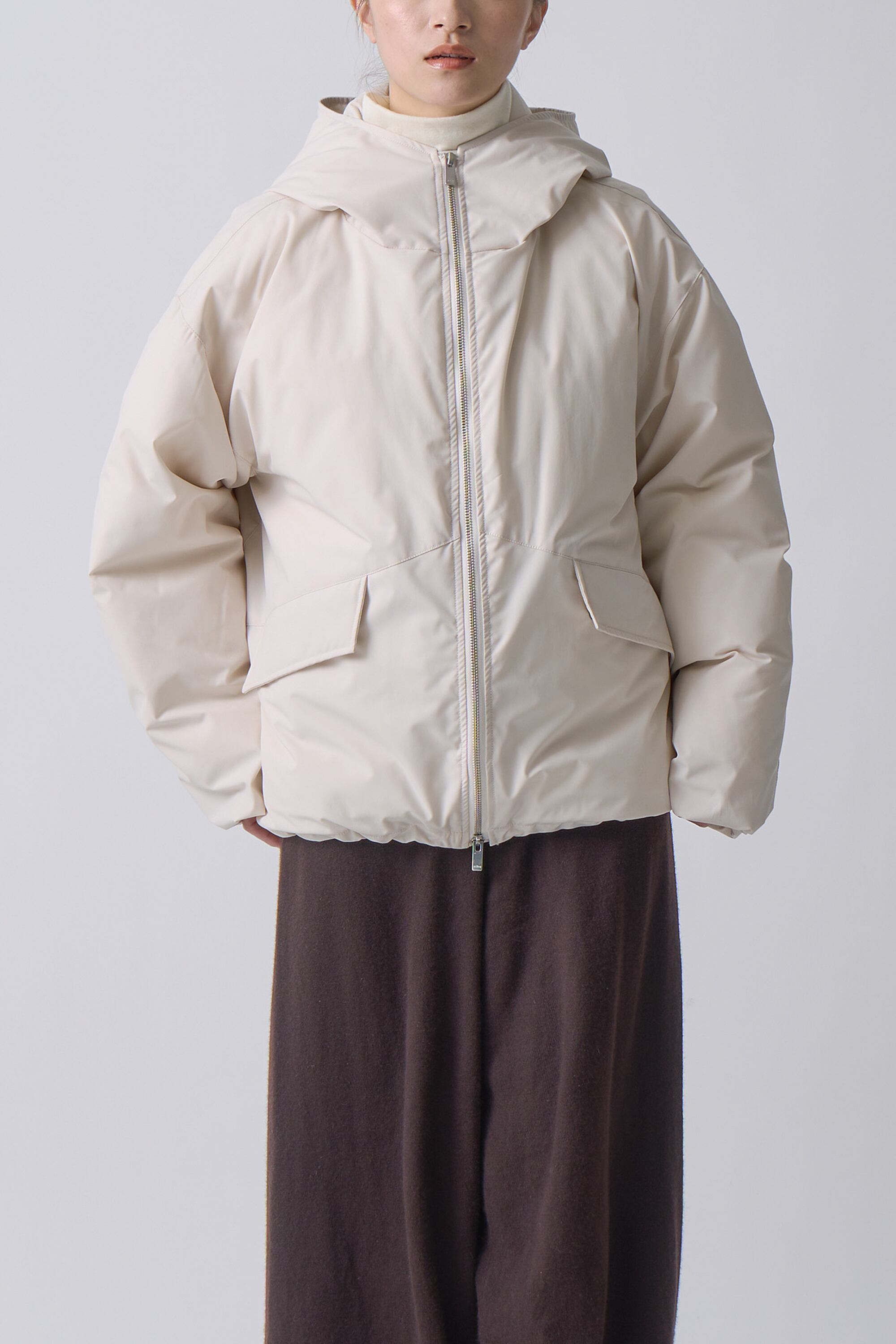 ダウン量を細かく調整することでボリューム感を軽減し、すっきりとしたフォルムに仕上げたフーデッドジャケット