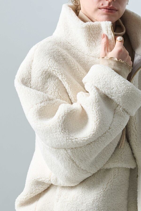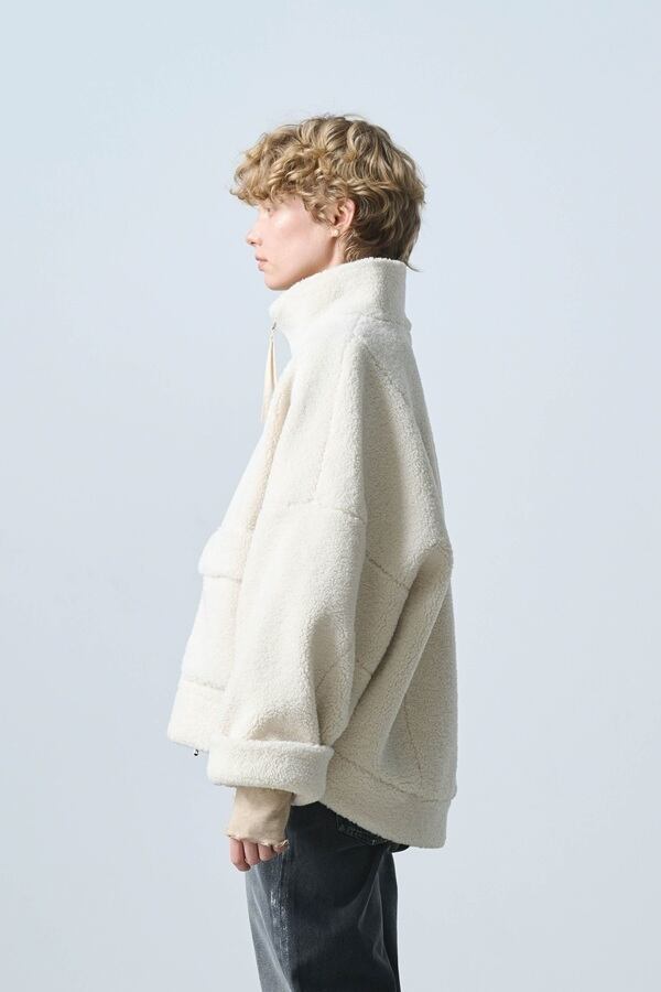 シープボアを使用したワイドスクエアシルエットのスタンドカラージャケットです。
